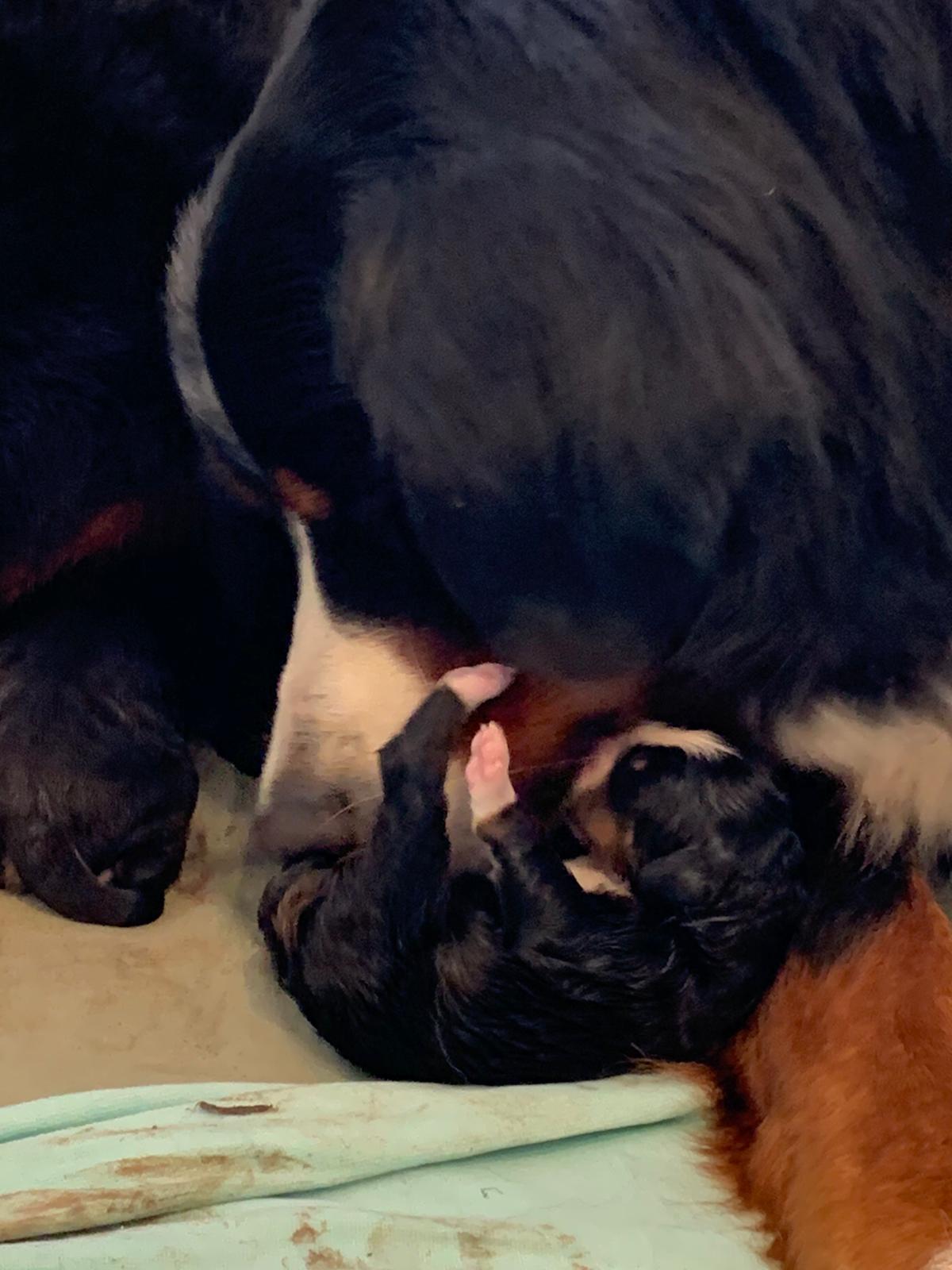 Mama Elly entwöhnt die Kids allmählich von der Milch - die spitzen Welpenzähnchen sind etwas unangenehm.